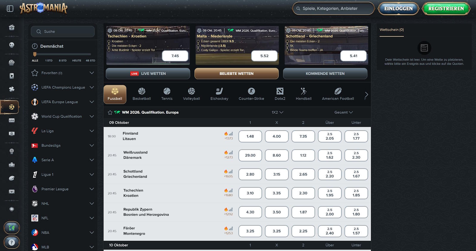 1.Dieses Angebot gilt nur für Neukunden, die sich auf unserer Website registriert und dort ihre erste Echtgeld-Einzahlung getätigt haben. 2.Mit der ersten Einzahlung in Höhe von mindestens 20 EUR erhältst du 1 Gratis-Pick bei der Bonuskrabbe. Ein Spieler kann sie nutzen, indem er den Bereich Bonuskrabbe besucht. 3.Die Mindesteinzahlung, um einen Bonus für die erste, zweite, dritte oder vierte Einzahlung zu erhalten, beträgt 20 EUR. 4.Die erste Einzahlung kann einen 100%igen Bonus bis zu einem Maximalbetrag von 1,000 EUR und 200 Freispiele aktivieren. 5.Die zweite Einzahlung kann einen Einzahlungsbonus von 75% bis zu einem Höchstbetrag von 500 EUR aktivieren. 6.Die dritte Einzahlung kann einen 50%igen Einzahlungsbetrag bis zum Maximalbetrag von 500 EUR und 50 Freispiele aktivieren. 7.Die vierte Einzahlung kann eine 25%ige Einzahlung bis zum Maximalbetrag von 1,000 EUR und 100 Freispiele aktivieren. 8.Der Bonus wird sofort nach einer erfolgreichen Einzahlung gutgeschrieben. Bitte kontaktieren Sie uns per Live-Chat oder E-Mail unter support@astromania.com, sollte der Bonus nicht gutgeschrieben werden. 9.Jeder der Willkommensboni kann nur beansprucht werden, bevor Wetten mit der Ersteinzahlung getätigt werden. 10.Eine Auszahlungsanforderung vor Inanspruchnahme des Bonus oder nach Aktivierung des Bonus führt zur Aufhebung der Bonusberechtigung. 11.Einzahlungen über Neteller oder Skrill berechtigen nicht zur Teilnahme an dieser Aktion. 12.Ein Spieler kann einen aktiven Bonus jederzeit im Profilbereich oder durch Kontaktaufnahme mit unserem Support-Team stornieren. Durch die Stornierung des Bonus wird der gesamte Betrag im Casino-Bonusguthaben ungültig. 13.Der maximale Einsatz, der während eines aktiven Casino-Bonus erlaubt ist, beträgt 5 EUR. 14.Für alle Boni aus dem Willkommenspaket gilt eine 35-fache Umsatzbedingung, die der Summe aus Einzahlung und Bonusbeträgen entspricht. 15.Verschiedene Spiele tragen unterschiedlich zur Bonusfreigabe bei. Die vollständigen Bedingungen für den Casino Bonus findest du im Abschnitt 7 der Allgemeinen Geschäftsbedingungen. 16.Die Umsatzbedingungen für einen Bonus müssen innerhalb von 10 Tagen nach Aktivierung des Bonus erfüllt erden. Sollte der Umsatz in diesem Zeitraum nicht erfüllt werden, werden der Bonusbetrag und mögliche Gewinne ungültig. 17.Dieser Bonus kann nicht gleichzeitig mit anderen Boni (Aktionen) kombiniert werden. Wenn du einen anderen Bonus aktivierst oder Freispiele in Anspruch nimmst, während du einen aktiven Bonus hast, werden der aktuelle aktive Bonus und alle entsprechenden Gewinne automatisch entfernt. 18.Diese Aktion ist nicht befristet. Unsere Website behält sich jedoch das Recht vor, die Aktion nach eigenem Ermessen und ohne vorherige Ankündigung zu ändern und zu beenden. 19.Diese Aktion ist in Übereinstimmung mit den Allgemeinen Geschäftsbedingungen gültig.